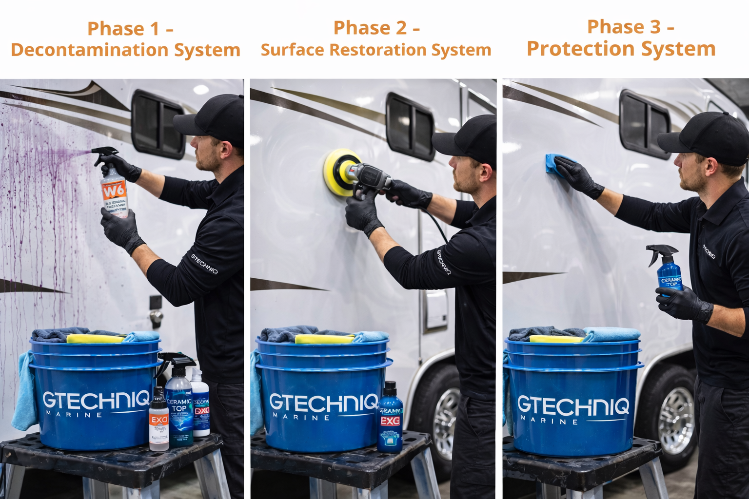 We don’t offer basic RV washing. We specialize in oxidation removal and long-term marine ceramic protection for fiberglass and gelcoat surfaces